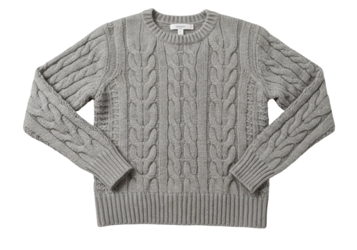 Isolated gray knit sweater, cable knit design, crew neck, fashion winter garment wear