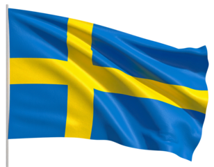 Swedish flag waving in wind with blue and yellow cross design on fabric, isolated on a transparent background