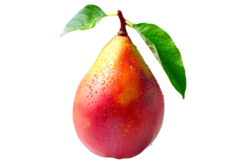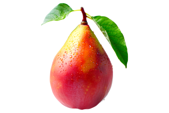 Ripe mango with green leaves and water drops isolated on white transparent background, colorful, organic, exotic, and delicious.