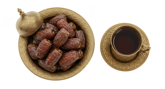 Isolated Transparent PNG of Golden Bowl Full of Dates and Tea Cup