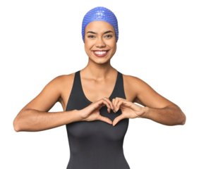 Pro Latina swimmer in studio gear smiling and showing a heart shape with hands.