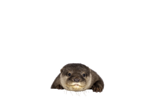Head shot of cute young Asian small clawed otter aka Aonyx cinerea, standing behind edge. Looking towards camera. isolated on a transparent background.
