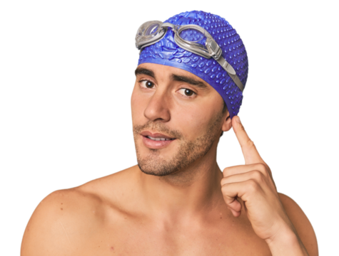 Close-up portrait of swimmer in blue swim cap and goggles on transparent background, athletic training concept