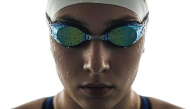 Focused competitive swimmer wearing white cap and blue reflective goggles with water droplets on face against white background, symbolizing dedication, calm concentration and elite aquatic performance