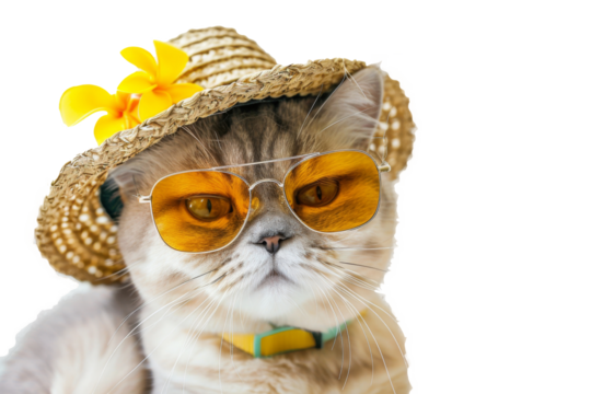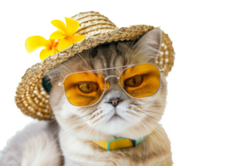 Happy smile kitty Cat wear sunglasses with summer season costume isolated on background, pets summer, lovely cat, holiday vacation.