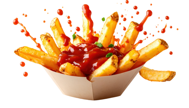 floating Crispy Fries with Splashing Hot Chili Sauce in motion on white