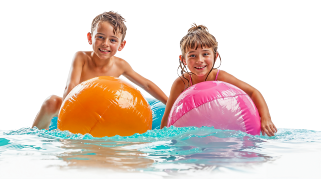 Summer Fun with Beach Balls: Two joyful kids splash in the waves, riding their colorful inflatable beach balls with pure summer joy.