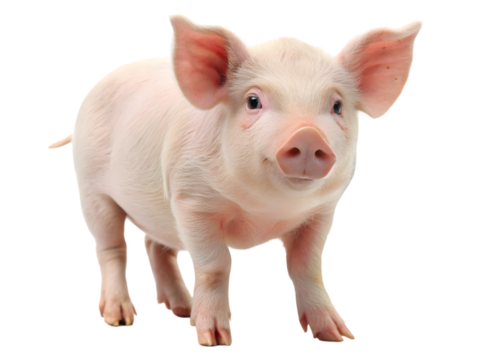 A pig is standing in front of a white background. The pig is pink and has a curious expression on its face