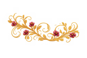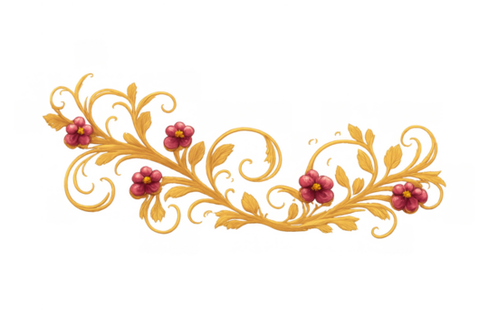 Golden vintage floral scroll ornament with red flowers, a baroque style filigree design element