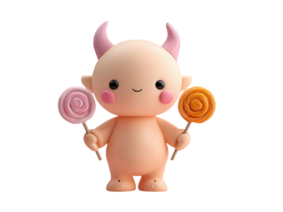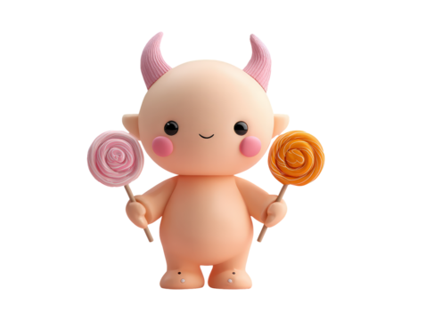 A cute chubby devil-like creature with pink horns holding two colorful swirl lollipops.