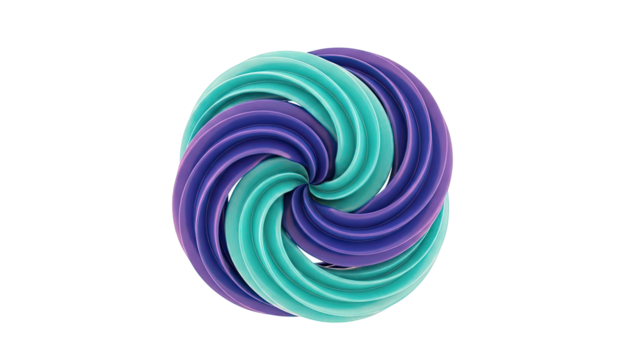 Two swirling torus shapes, glowing with purple, blue, and pink hues, against a black backdrop, create a captivating display