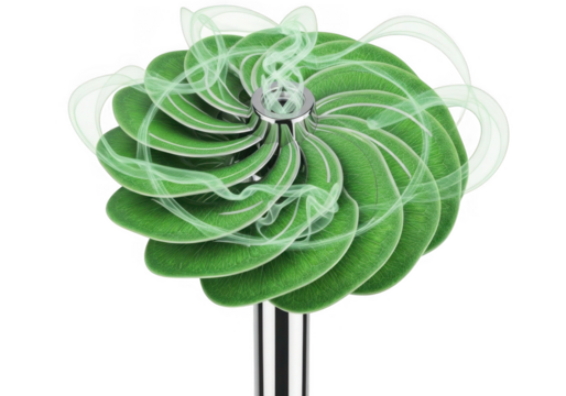 Green turbine with swirling smoke isolated on transparent background for eco energy and innovation