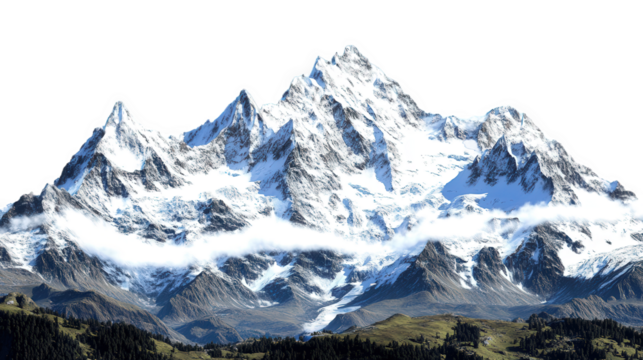 snow mountain alps peak with cliff, rocks and meadow isolated on transparent background, png file
