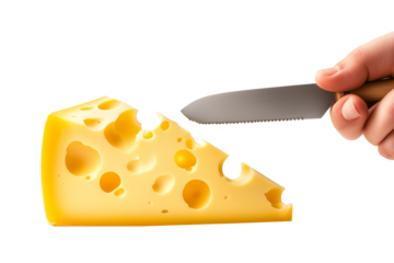 Hand holds a knife cutting into a block of Swiss cheese isolated on white transparent background. Minimalistic style dairy products, food preparation