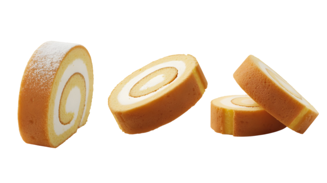 Three slices of swiss roll cake with cream filling, dusted with powdered sugar, isolated on transparent background