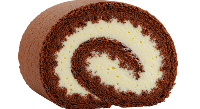 Delicious chocolate swiss roll cake slice with cream filling on transparent background
