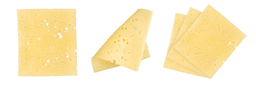 Swiss cheese png isolate. Cheese slices with many small holes, close-up. Swiss cheese is cut into thin slices of different shapes, isolated on a white background.