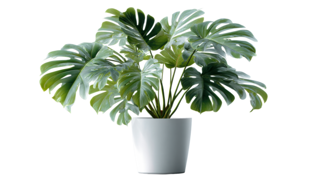 Large Swiss Cheese Plant Leaves in White Pot on Light Surface, cut out transparent