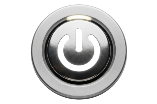 Silver metallic power button with illuminated white symbol in the center isolated with transparent background
