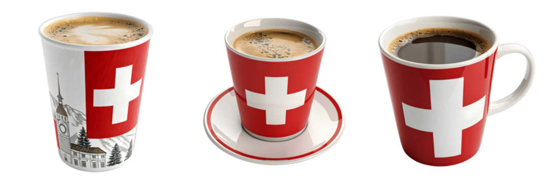 Set For Three cups of coffee are decorated with the swiss flag, isolated on transparent background