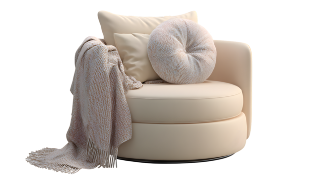 Modern and elegant cream colored swivel chair with pillows and a blanket for relaxation and comfort
