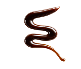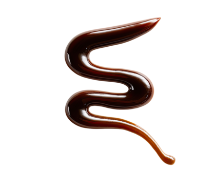 Dark brown, glossy, flowing liquid in a wavy, S-shaped form against transparent background