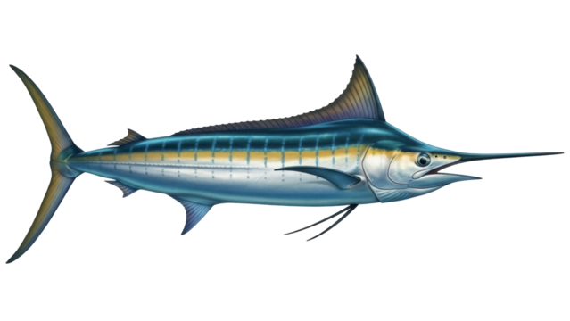 Striking blue marlin PNG isolated on transparent background, majestic sea creature with elongated bill and streamlined body, marine wildlife