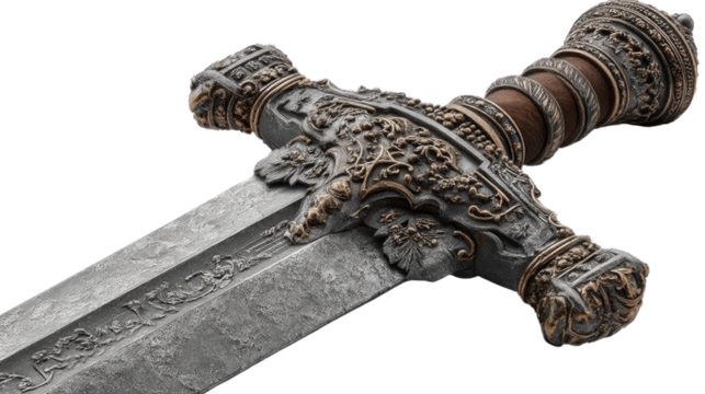 Ornate Medieval Sword Detail: Close-up view of an intricately designed medieval sword, showcasing its ornate hilt and textured blade.