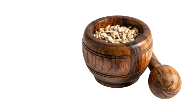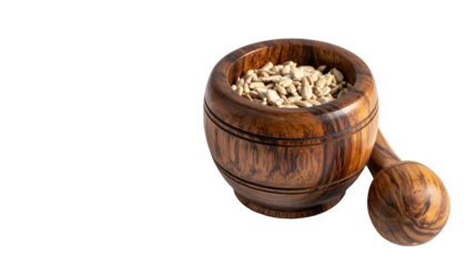 A traditional kitchen toolset with a bowl, mortar, and wooden pestle for grinding ingredients