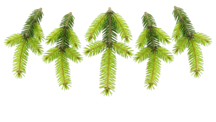 Symmetrical arrangement of five vibrant green evergreen branches on a pristine white background, showcasing nature's fresh foliage