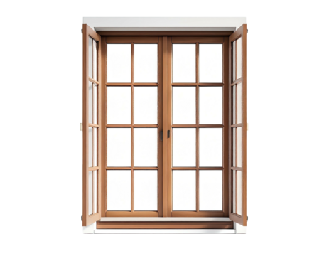 Open wooden window with grilles and white frame