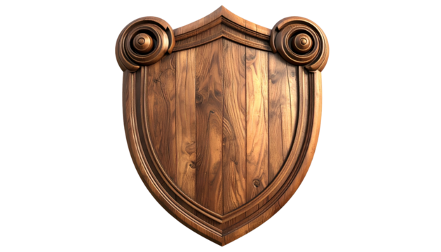 Wooden shield with ornate flourishes on a black background, symmetrical and detailed