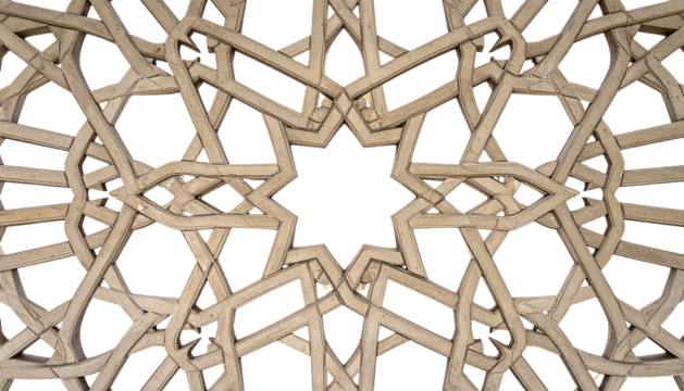 Ornate, symmetrical geometric carved wooden latticework, black void