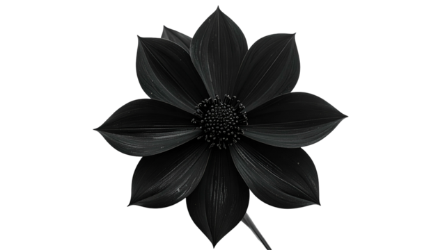 An isolated black flower with many petals and a dark textured center, set against a void