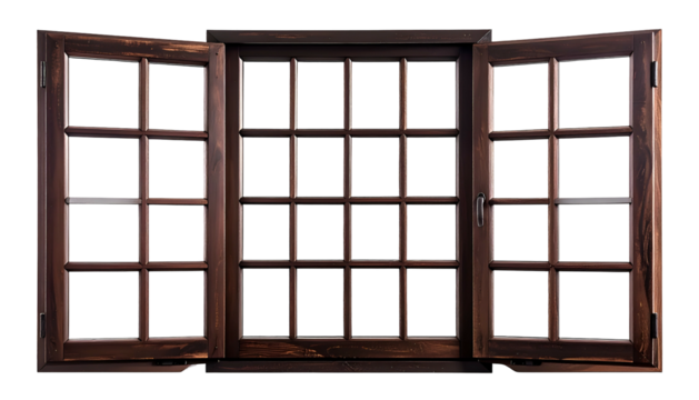A detailed image of an open wooden window with several panes, showcasing its design