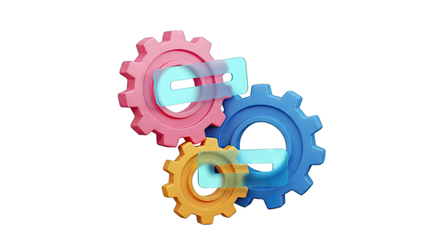 Three interlocked gears in various bright colors represent teamwork and synergy isolated on white background