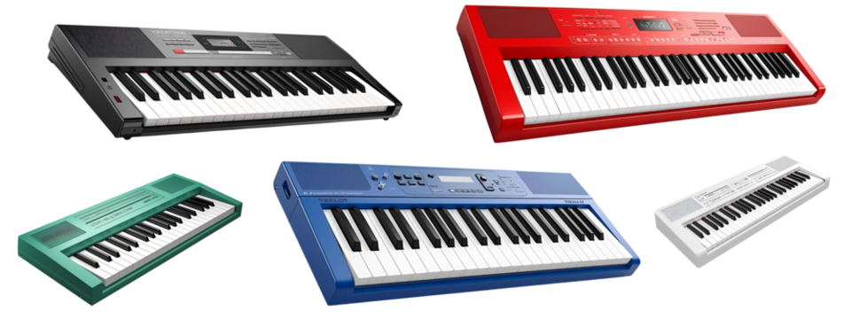 Musical Spectrum: An assortment of colorful synthesizers displays the diverse sounds of music. Presenting a wide range of keyboard instruments.