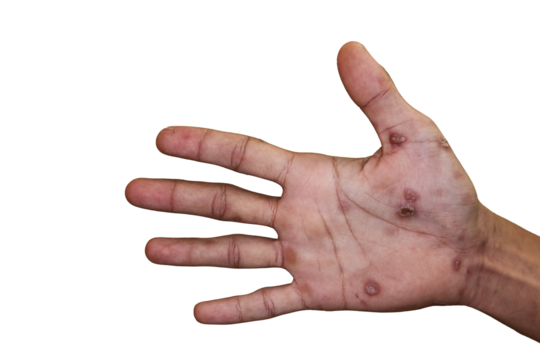 Close up of Secondary stage syphilis sores (lesions) on the palms of the hand. Referred to as "palmar lesions" PNG.