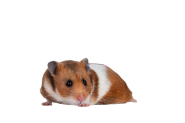 Cute Syrian or golden hamster, standing side ways head turned. Looking beside camera. Isolated cutout on a transparent background.