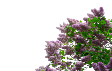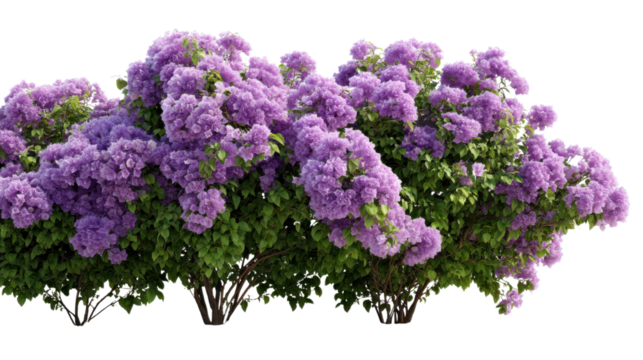 Two blooming lilac bushes with purple flowers and green leaves isolated on transparent background