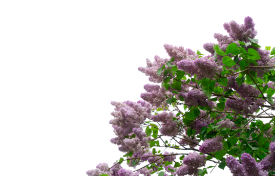 Gracefully curved common lilac branch with delicate purple-pink flowers and green leaves, macro shot against transparent with copy space, soft diffused light, pristine spring floral concept