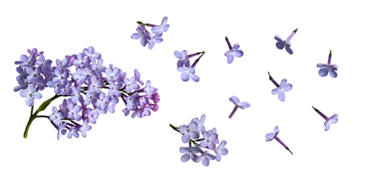 Beautiful light purple lilac flower blossom petals falling down isolated on transparent background for spring design