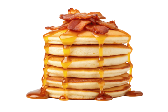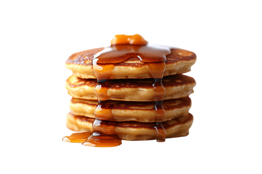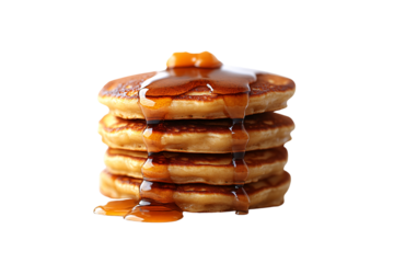 Syrup pours over buttery pancakes, cascading in golden layers, making a sweet, mouthwatering breakfast treat, isolated on a transparent background