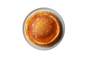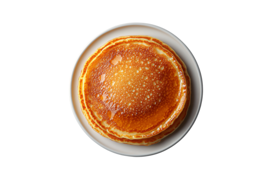 Neatly stacked pancakes on clean white plate, topped with syrup, creating a classic breakfast presentation, isolated on a transparent background