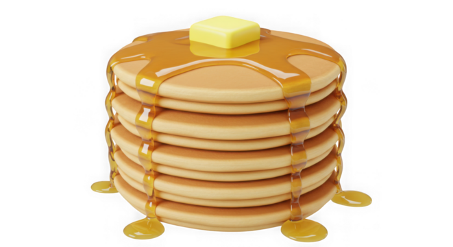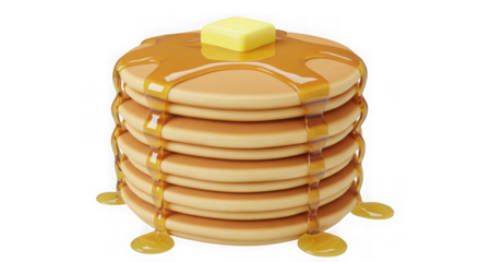 Stack of golden brown pancakes 3D with butter and syrup, classic breakfast food digital illustration