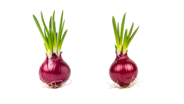 Two freshly harvested red onions with vibrant green stalks and delicate root systems on a black background