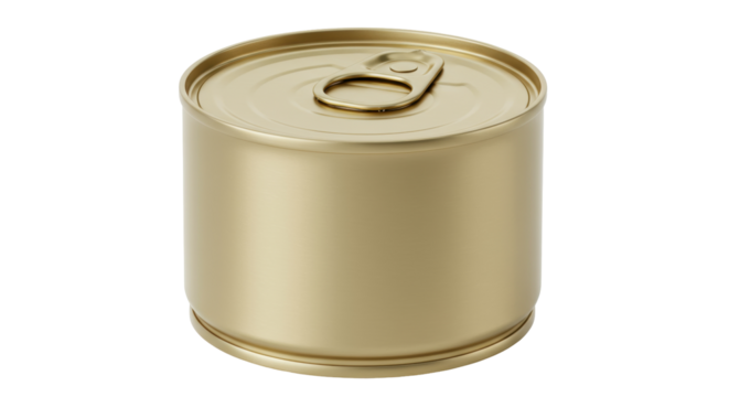 Gold metal food can isolated on transparent background, canned goods container for preservation and storage PNG