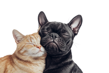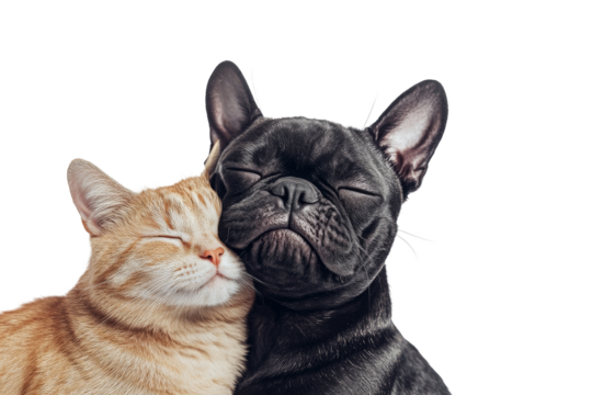 Cute bulldog and orange tabby cat sleeping together isolated on transparent background