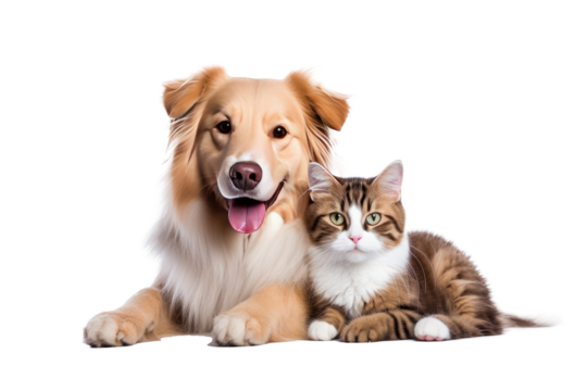 Portrait of Happy dog and cat that looking at the camera together isolated on transparent background, friendship between dog and cat, amazing friendliness of the pets.