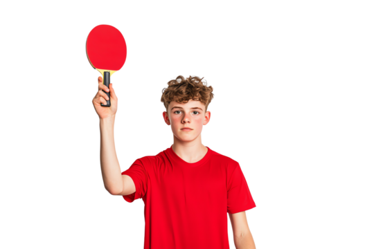 A young person in a red shirt holds a red table tennis paddle high.